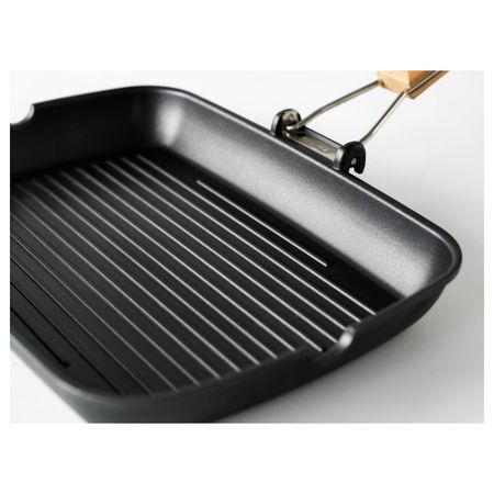 Складная ручка позволяет экономить место при хранении.Благодаря ребристой поверхности дна на готовом блюде появляются аппетитные полоски.Благодаря носикам по бокам удобно сливать жир.Сделано из алюминия.