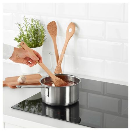 Не повреждает антипригарное покрытие кастрюль и сковородок. В набор входит: 2 лопаточки (31 см) и 1 вилка (31 см). Массив бука, Масло. Возобновляемый материал (древесина).