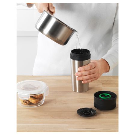 Благодаря герметичной крышке кружку с напитком можно взять с собой, не опасаясь, что напиток прольется. Съемный фильтр позволяет использовать кружку как для кофе, так и для чая. Крышку легко открыть одной рукой. Размер: 35 сл