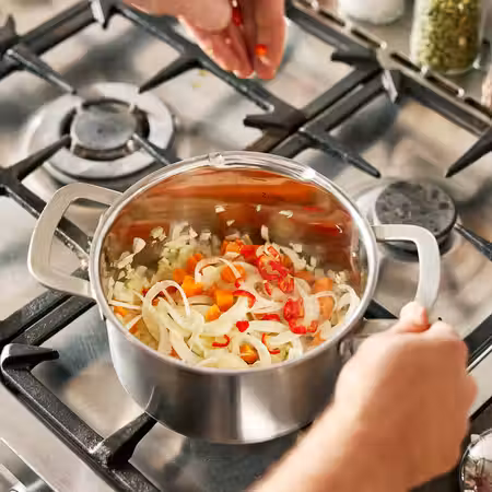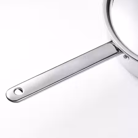 Эта кастрюля из нержавеющей стали оснащена носиком, облегчающим наливание и слив жидкости, и крышкой из термостойкого стекла со встроенным ситечком.