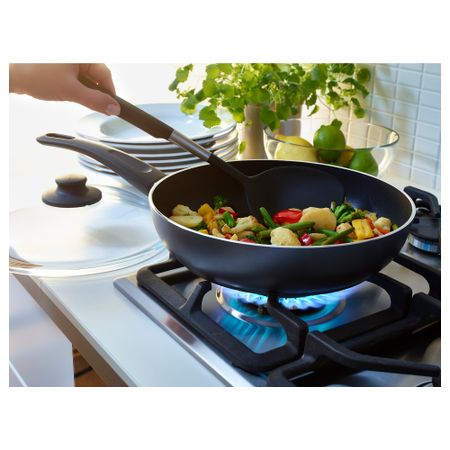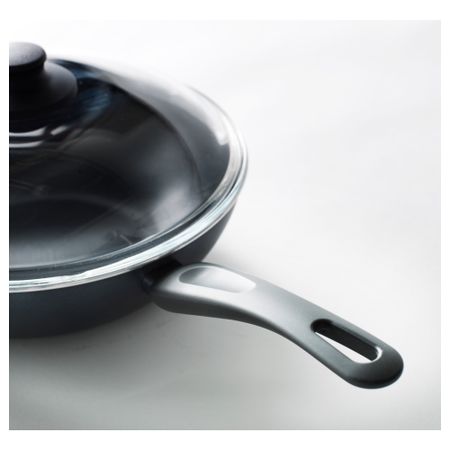 Сковороду легко поднять благодаря удобной ручке. Толстые стенки и дно равномерно распределяют тепло. Стеклянная крышка позволяет контролировать процесс приготовления блюда. Сделано из алюминия. Размер: 26 см