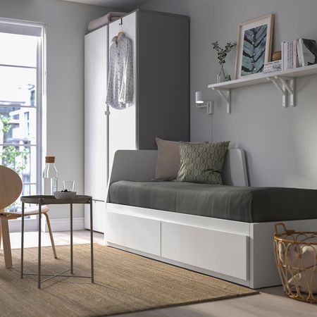 Когда эти две кровати стоят одна на другой, это односпальная кровать или диван. А по отдельности они могут служить двуспальной кроватью, угловым диваном или двумя отдельными кроватями. И их всегда можно снова объединить, чтобы освободить место