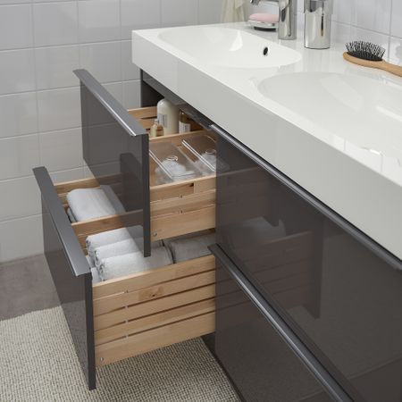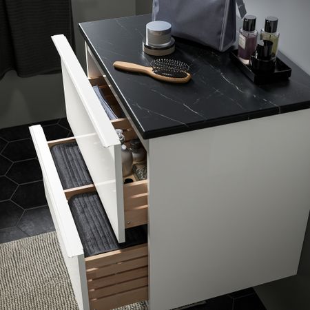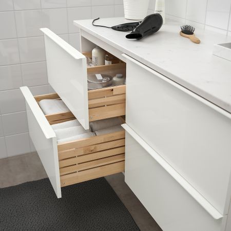 Вещи, которые используются часто — ватные диски, щетки и средства гигиены, удобно хранить в верхнем ящике, а для полотенец используйте нижний ящик. Уникальные клиновые дюбели упрощают сборку, при этом соединения практически невидимы.