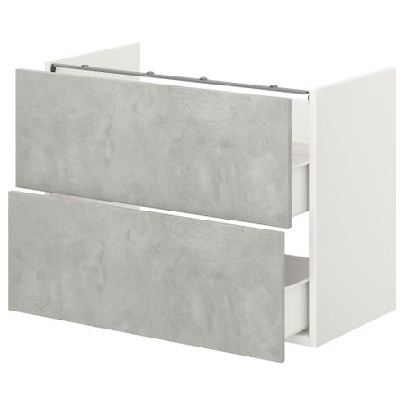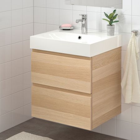 Отлично сочетаются с другими изделиями серии ХЕМНЭС. Минималистиный дизайн и искусное исполнение выдвижных ящиков и ручек подчеркивает скандинавский стиль. Раковина с панелью предотвращает попадание воды за шкаф.