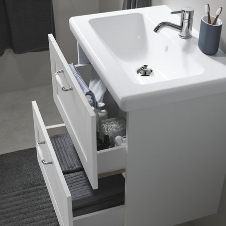 Дверцу можно навесить справа или слева.Отличное решение для маленькой ванной комнаты, ведь ширина напольного шкафа всего 40 см.Напольный шкаф для раковины прекрасно вмещает все принадлежности для гигиены, которые обычно создают ощущение беспорядка.