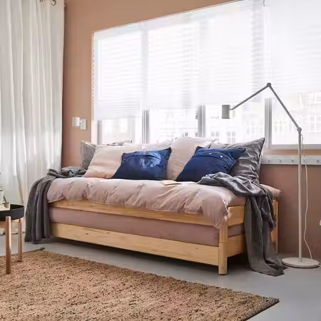 Когда эти две кровати стоят одна на другой, это односпальная кровать или диван. А по отдельности они могут служить двуспальной кроватью, угловым диваном или двумя отдельными кроватями. И их всегда можно снова объединить, чтобы освободить место