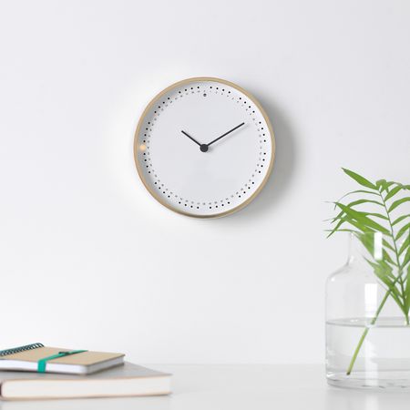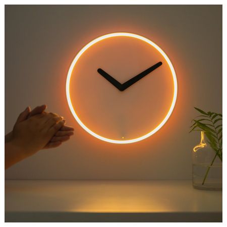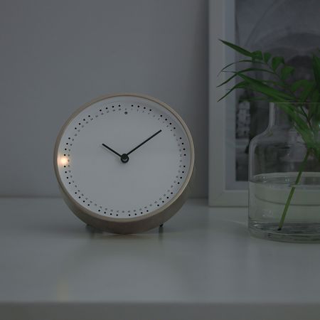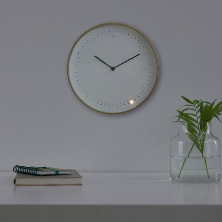 У часов нет секундной стрелки. Маленькие лампочки, расположенные вокруг циферблата, загораются, отмечая каждые пять секунд.Светочувствительный сенсор реагирует на уровень освещенности помещения.