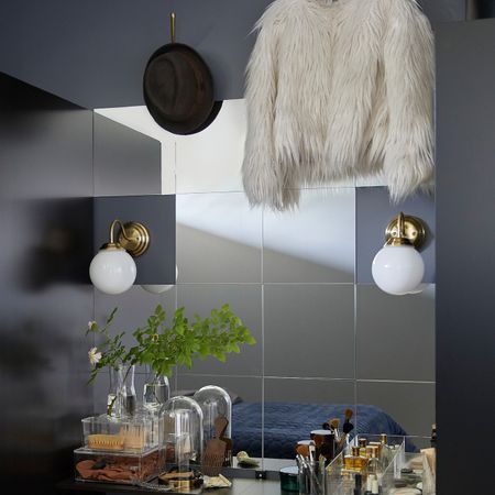 Держатель и полочку легко установить на комфортной высоте и при необходимости переставить.На полочке удобно хранить разные мелочи: ключи, украшения, заколки, которые обычно бесследно исчезают в больших ящиках.На крючки можно повестить бусы и шарфы.