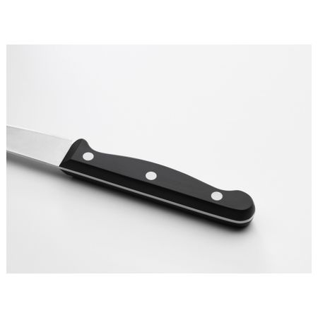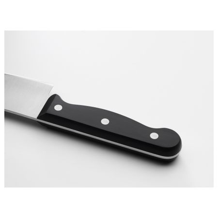 Нож с зубчатым лезвием подходит для резки хлеба и мягких овощей, например томатов. Нож из нержавеющей молибден-ванадиевой стали долго остается острым. Хвостовик ножа проходит по всей длине ручки, делая ее прочной и обеспечивая ножу хороший баланс. Размер: 23 см