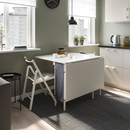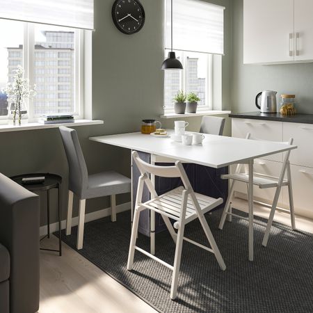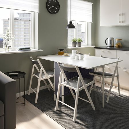 Этот стол на 4 человек легко разложить, чтобы за ним комфортно разместились 6 человек.Вкладную доску легко достать и установить, а когда гости уйдут, снова убрать под столешницу.Белую гладкую столешницу легко поддерживать в чистоте.