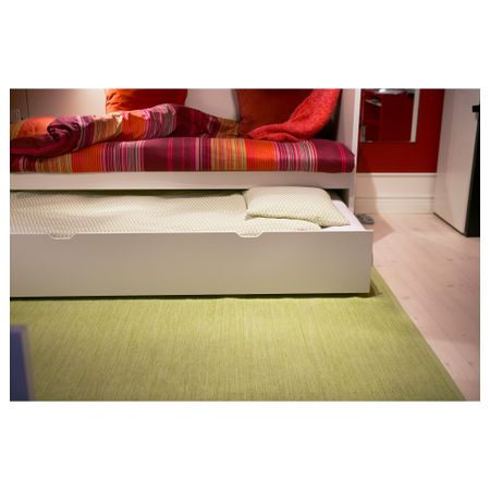 Эта выдвижная кровать устанавливается под каркас кровати с изголовьем ФЛАКСА и при необходимости обеспечивает дополнительное спальное место. Благодаря прорезным ручкам и колесикам легко выдвигать и задвигать. Реечное дно кровати прилагается. Размер: 90x200 см