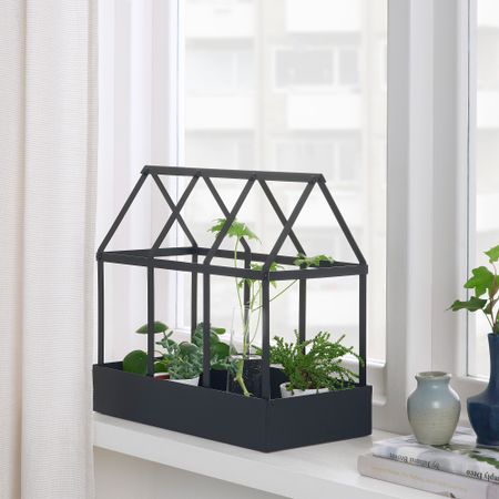 Поставьте в теплицу комнатные цветы, саженцы или просто декоративные аксессуары, которые вы хотите держать на виду. Каркас может служить опорой для вьющихся растений.