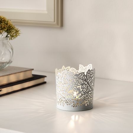 Товары серии САМВЕРКА украшает ажурный орнамент с изображением листьев и птиц, благодаря которому ваши цветы и свечи будут выглядеть еще романтичнее. Теплый свет свечи красиво проходит через орнаментальную поверхность подсвечника.