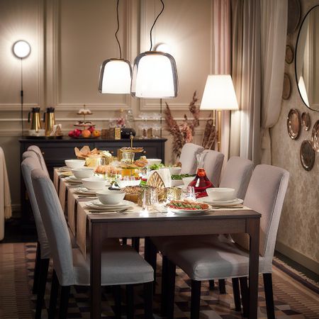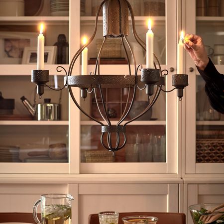 Канделябр обеспечивает хорошее освещение над обеденным столом. Чтобы создать более атмосферное освещение, выключите эклектический свет и зажгите в канделябре обычные или греющие свечи.Лампочка продается отдельно.