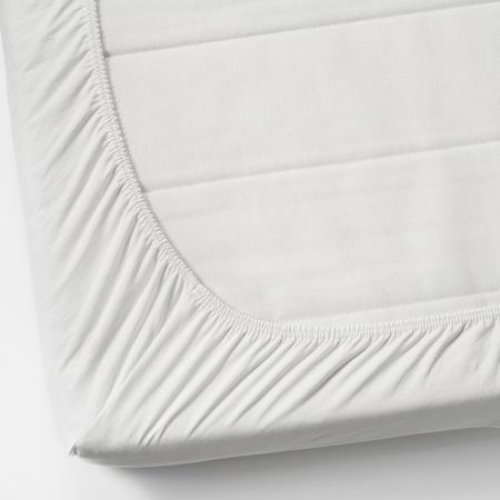 Натяжная серо-зеленая простыня ДВАЛА изготовлена из дышащей и поглощающей влагу хлопковой ткани, что обеспечивает ровную и комфортную температуру в течение всей ночи.