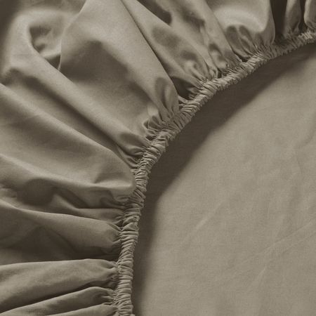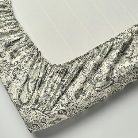Натяжная серо-зеленая простыня ДВАЛА изготовлена из дышащей и поглощающей влагу хлопковой ткани, что обеспечивает ровную и комфортную температуру в течение всей ночи.