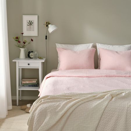 Простыни и наволочки РЁННВЕККМАЛ из высококачественного хлопкового перкаля на ощупь кажутся прохладными.