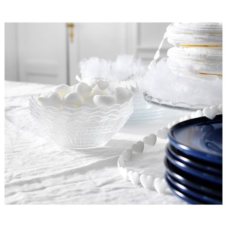 Изготовлено из прочного закаленного стекла. Эта нарядная посуда с изящным «кружевным» краем создаст праздничную атмосферу за столом. Прекрасно сочетается с другой столовой посудой. Диаметр: 17 см. Высота: 5 см. Закаленное стекло. Размер: 17 см