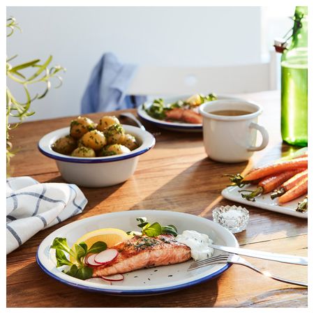 Тарелку ЭГЕНДОМ из прочной эмалированной стали можно использовать на пикнике или в походе и легко мыть. Удобно для детей.Кромка покрашена вручную, что создает естественные вариации цвета.Вымойте изделие перед первым использованием.