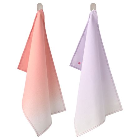С петелькой для подвешивания. 2 небольших кухонных полотенца, созданные дизайнером Марисоль Сентено. Цвет постепенно переходят от светлого к темно-розовому и фиолетовому. Удобно вешать за петельку, а также можно использовать в качестве салфеток.