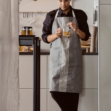 Длина завязок регулируется.Ткань из льна и хлопка; сочетает блеск и прочность льна с мягкостью хлопка.С петелькой, например для кухонных щипцов.Удобные карманы для мелких вещей.Благодаря петельке удобно повесить, когда фартук не используется.