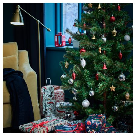Крючки прилагаются – не нужно покупать дополнительно. Прочный материал – не разобьется при падении. В набор входит: 3 шара (диам. 5 см), 3 шара (диам. 5,5 см), 5 шишек (высота 6 см), 5 звездочек (высота 4,5 см) и 8 колокольчиков (высота 4 см).