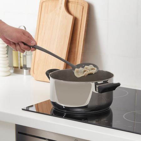 Материалы и дизайн ручки обеспечивают удобный захват.Выемка на ручке предотвращает соскальзывание в кастрюлю. Длина: 34 см. Ручка: Армированная полиамидная пластмасса, Силиконовый каучукПерекладина/ Нижняя часть: Нержавеющая сталь
