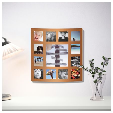 В раму в любой момент можно вставить новые фотографии. Защитный фронтальный лист из пластика обеспечивает безопасное использование. Рама на 13 картин: 1 картина 19x19 см, 12 картин 9x9 см. Для разных стен требуются различные крепежные приспособления Размер: 43x43 см