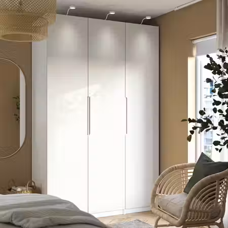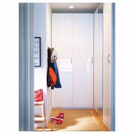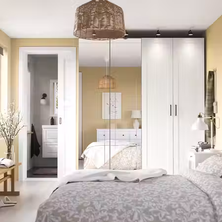 С этой белой дверцей благородного оттенка ваш гардероб PAX будет прекрасно сочетаться с комодом, каркасом кровати и прикроватной тумбой TONSTAD.