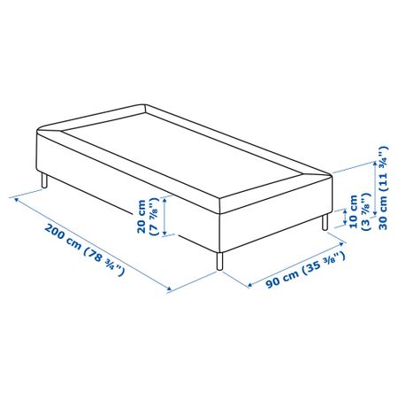 Длина матраса:200 см Ширина матраса:160 см Размер и вес упаковки 6 упаковки ножка BURFJORD Номер товара: 402.996.87 Упаковки: 2 Длина: 23 см Ширина: 13 см Высота: 6 см Вес: 1,05 кг Вес нетто: 0,99 кг основание для матраса ESPEVÄR Номер товара: 403.