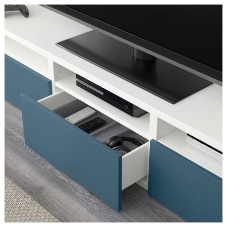 Двери и ящики закрываются плавно и бесшумно. Три больших ящика обеспечат идеальный порядок в хранении пультов, игровых устройств и других аксессуаров для ТВ. Настенные шкафчики позволяют эффективно использовать пространство над телевизором. Размер: 300x20/40x211 см