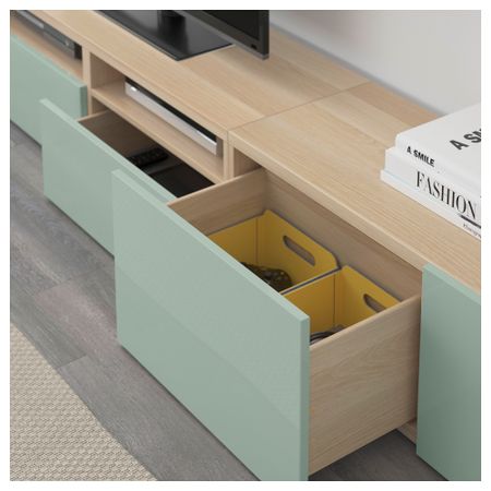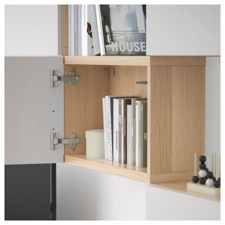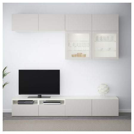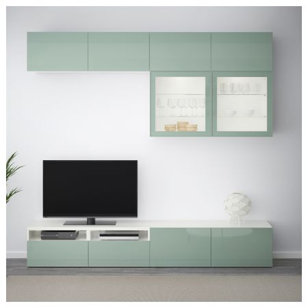 Благодаря интегрированному нажимному механизму ящики и дверцы открываются легким нажатием. Настенные шкафчики позволяют эффективно использовать пространство над телевизором. Размер: 240x40x230 см
