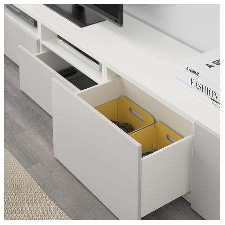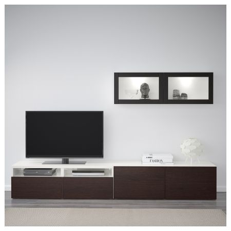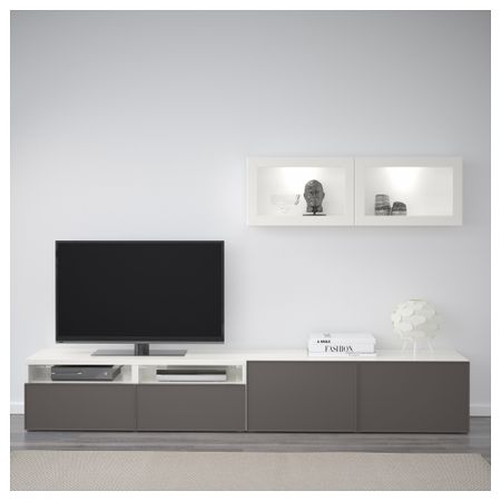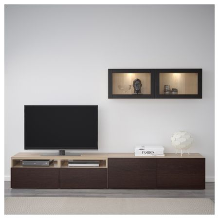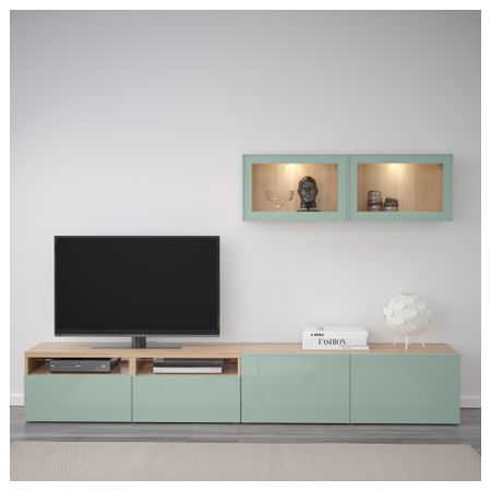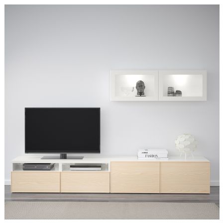 БЕСТО 892.056.25 Тумба под ТВ с ящиками и дверцей, под беленый дуб, Лаппвикен светло-серый прозрачное стекло (180x40x48 см)