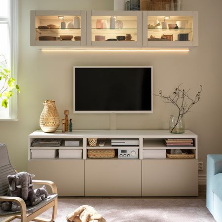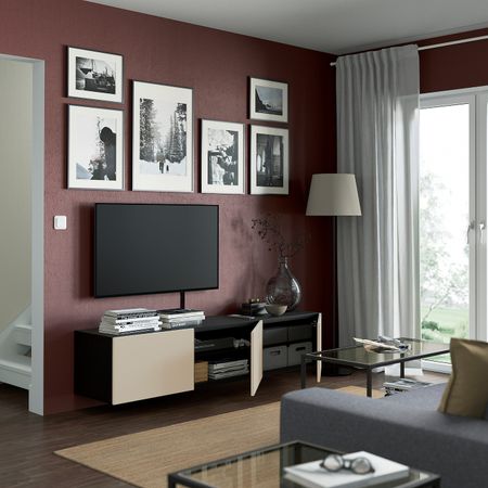 Чтобы подчеркнуть современный и лаконичный стиль интерьера, тумбу под ТВ БЕСТО можно закрепить на стене. Дополнительный плюс — ножки не будут мешать уборке.