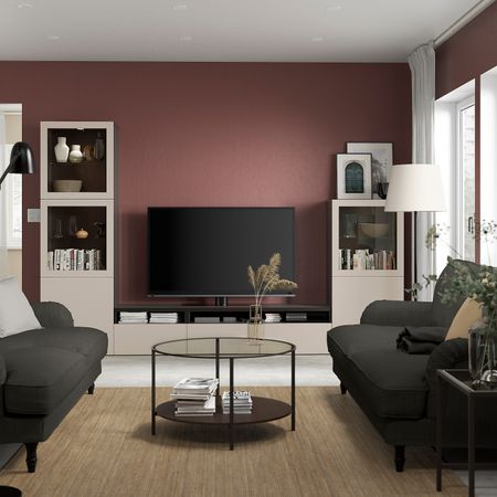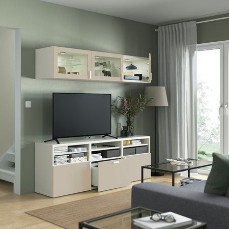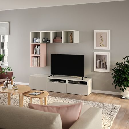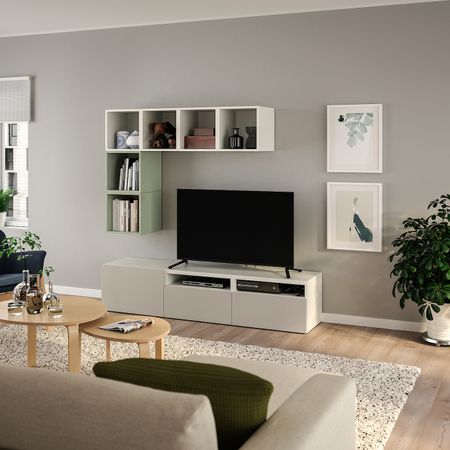 Рисунок древесных волокон на дверцах ХЕДЕВИКЕН позволяет создать выразительный орнамент на мебели БЕСТО.Комбинируйте открытое и закрытое хранение в зависимости от потребностей.