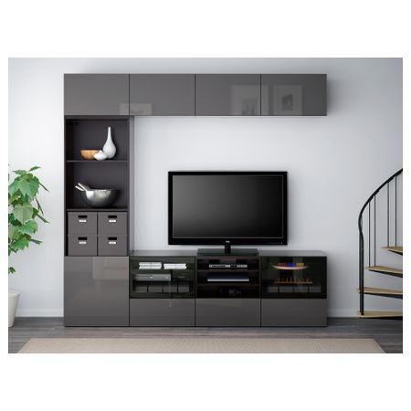 Благодаря доводчикам ящики и дверцы закрываются плавно и бесшумно. Пульт дистанционного управления работает через стекло. Настенные полки позволяют эффективно использовать пространство над телевизором. Размер: 240x40x230 см