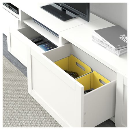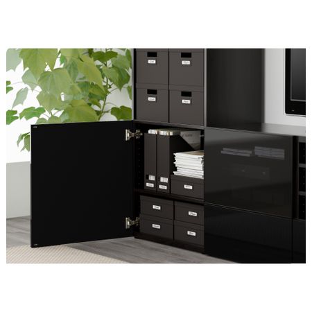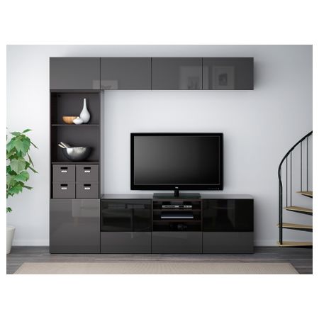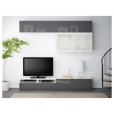 Благодаря доводчикам ящики и дверцы закрываются плавно и бесшумно. Пульт дистанционного управления работает через стекло. Настенные полки позволяют эффективно использовать пространство над телевизором. Размер: 240x40x230 см