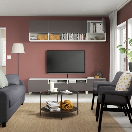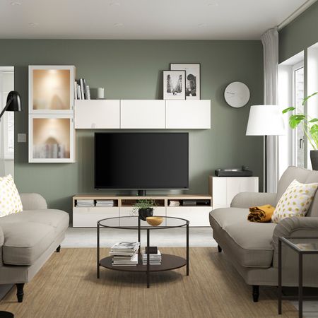 Комбинация для ТВ/стеклянные дверцы, под беленый дуб Синдвик/Ханвикен под беленый дуб, прозрачное стелко 300x42x231 см IKEA