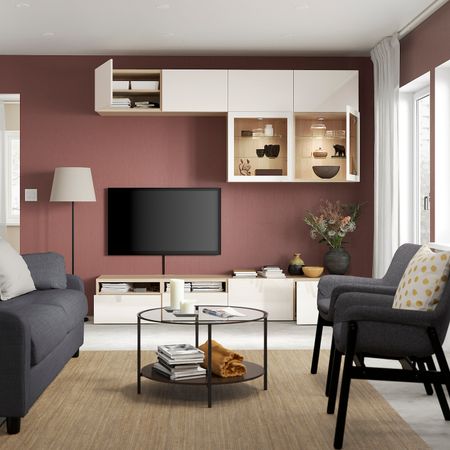 Тумба подойдет для телевизора и любимых вещей, которые вы хотите продемонстрировать за стеклянными дверцами.Благодаря нескольким отверстиям на задней панели тумбы под ТВ провода от телевизора и других устройств всегда будут под рукой, но не на виду.