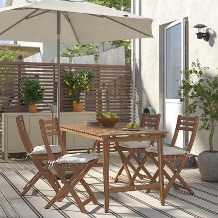Садовая мебель АСКХОЛЬМЕН с удобными подушками изготовлена из прочной древесины акации, полученной из ответственно управляемых лесных хозяйств.