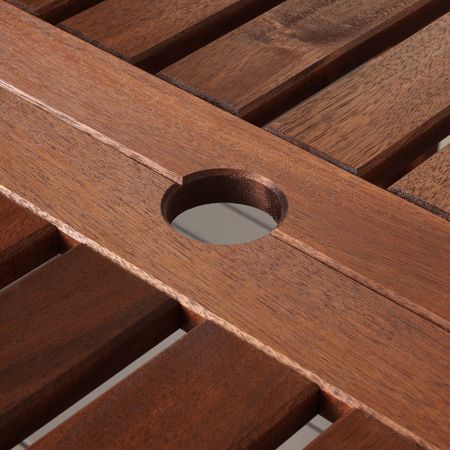 Откидные столешницы легко установить и убрать, что позволяет регулировать размер стола по необходимости.Отверстие в центре столешницы позволяет установить зонт от солнца.