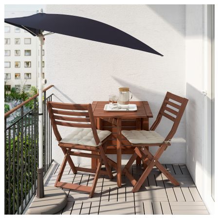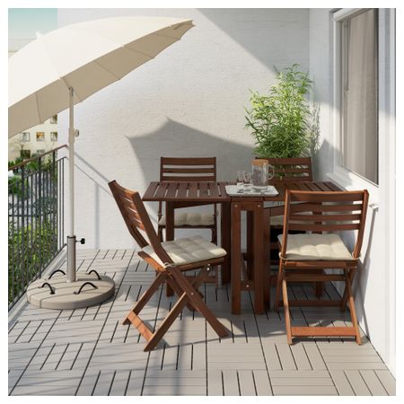 Откидные столешницы легко установить и убрать, что позволяет регулировать размер стола по необходимости. Отверстие в центре столешницы позволяет установить зонт от солнца. Мебель обработана полупрозрачной морилкой в несколько слоев.