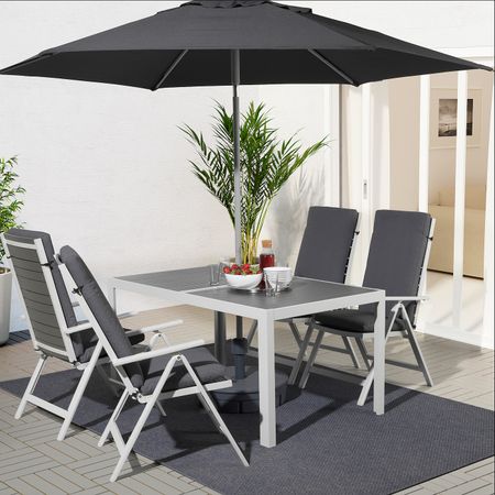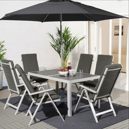 Спинку можно установить в одном из шести положений. Легко сложить и убрать. Стул не требует сборки, поэтому вы можете начать пользоваться им сразу же после покупки. Отверстие в центре столешницы позволяет установить зонт от солнца. Размер: 156x90 см