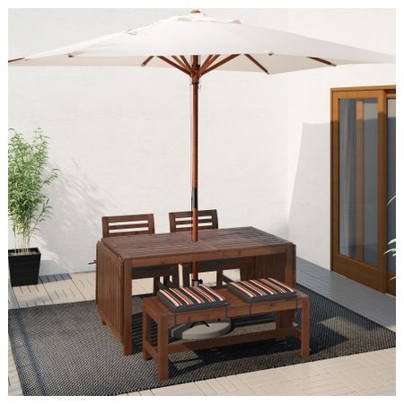 Отверстие в центре столешницы позволяет установить зонт от солнца. Мебель обработана полупрозрачной морилкой в несколько слоев. Это повышает ее прочность и подчеркивает выразительность натуральной фактуры дерева.
