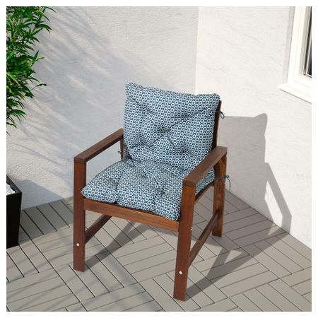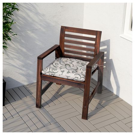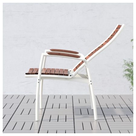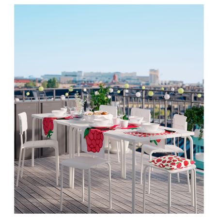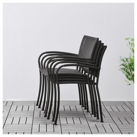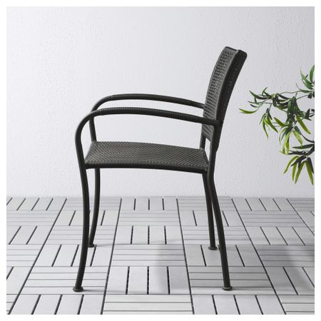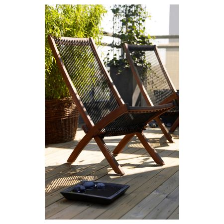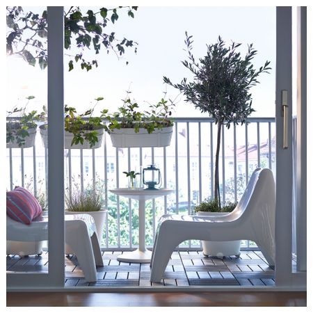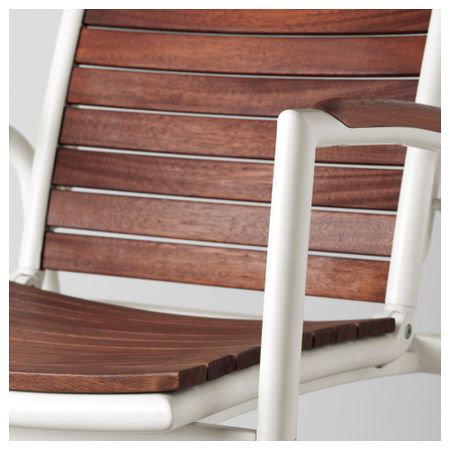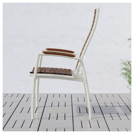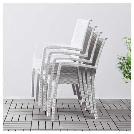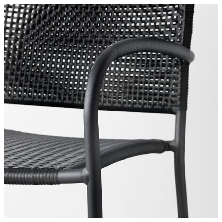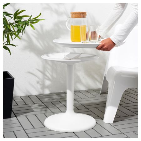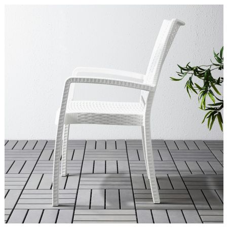 Съемную столешницу можно использовать как сервировочный поднос. Материалы, из которых изготовлена эта садовая мебель, не требуют ухода. Легко поддерживать в чистоте – достаточно протереть влажной тканью. Можно дополнить креслом ИКЕА ПС ВОГЭ.