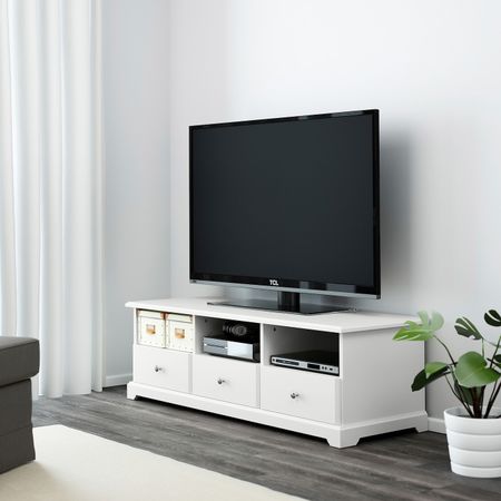 Ящики с плавным ходом и стопором.Отсутствие задней панели помогает собрать и организовать провода.Мы рекомендуем, чтобы тумба была немного шире, чем установленный на ней телевизор. Эта тумба подходит для телевизора до 57 дюймов.