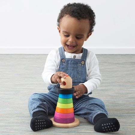 Собирая пирамидку, малыш учится различать цвета и размеры.Развивает мелкую моторику и логическое мышление.Рекомендовано для детей от 1 года.В набор входят 1 деревянная основа со стержнем из мягкого материала, 7 колец и наконечник.