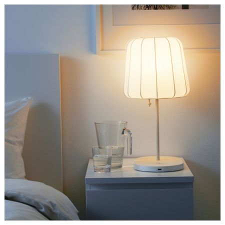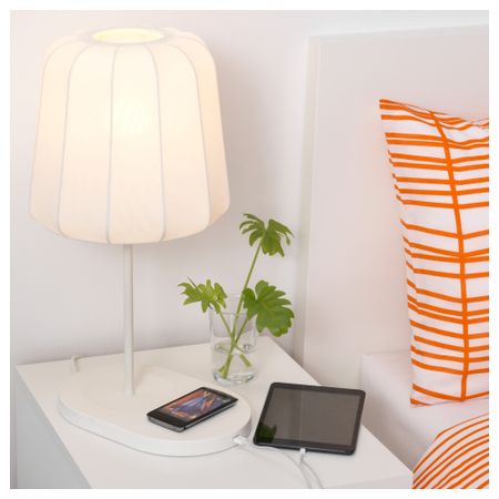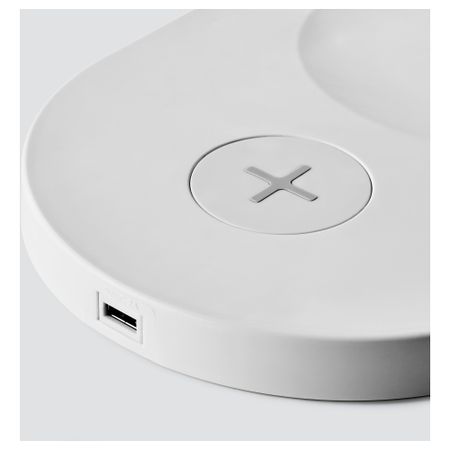 Чтобы зарядить смартфон, достаточно просто положить его на встроенное зарядное устройство. Можно заряжать 2 устройства одновременно, так как в светильник также интегрирован USB-порт.