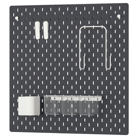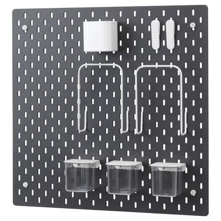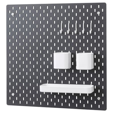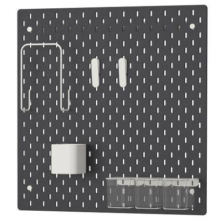 Контейнер/ полка: Сталь, Сталь, Эпоксидное/полиэстерное порошковое покрытие. Крючок: Сталь, Гальванизация, Порошковое покрытие. Настенная панель: Основные части: ДВП, Прозрачный акриловый лак. Металлические части: Сталь, Порошковое покрытие.