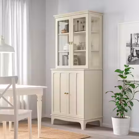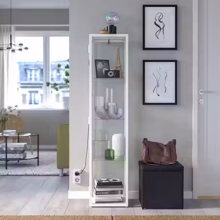 Шкаф-витрина позволяет продемонстрировать ваши бокалы и любимые безделушки, защищая их от пыли. Съемные полки легко установить на нужной высоте в соответствии с потребностями хранения.